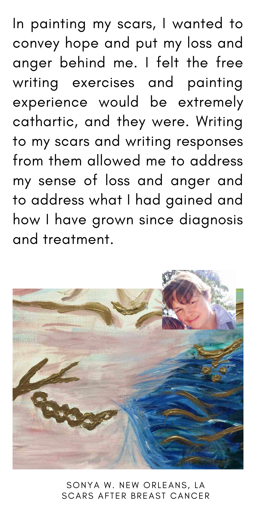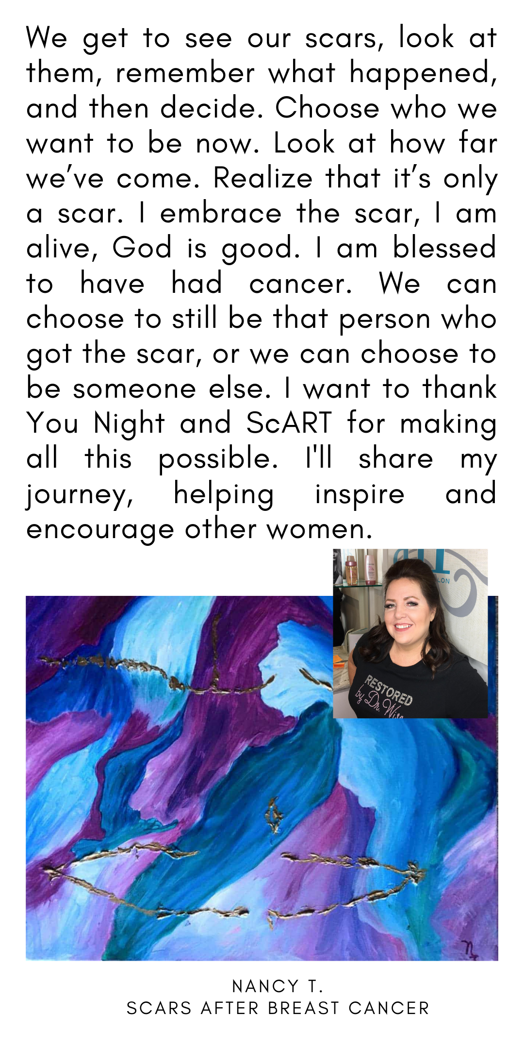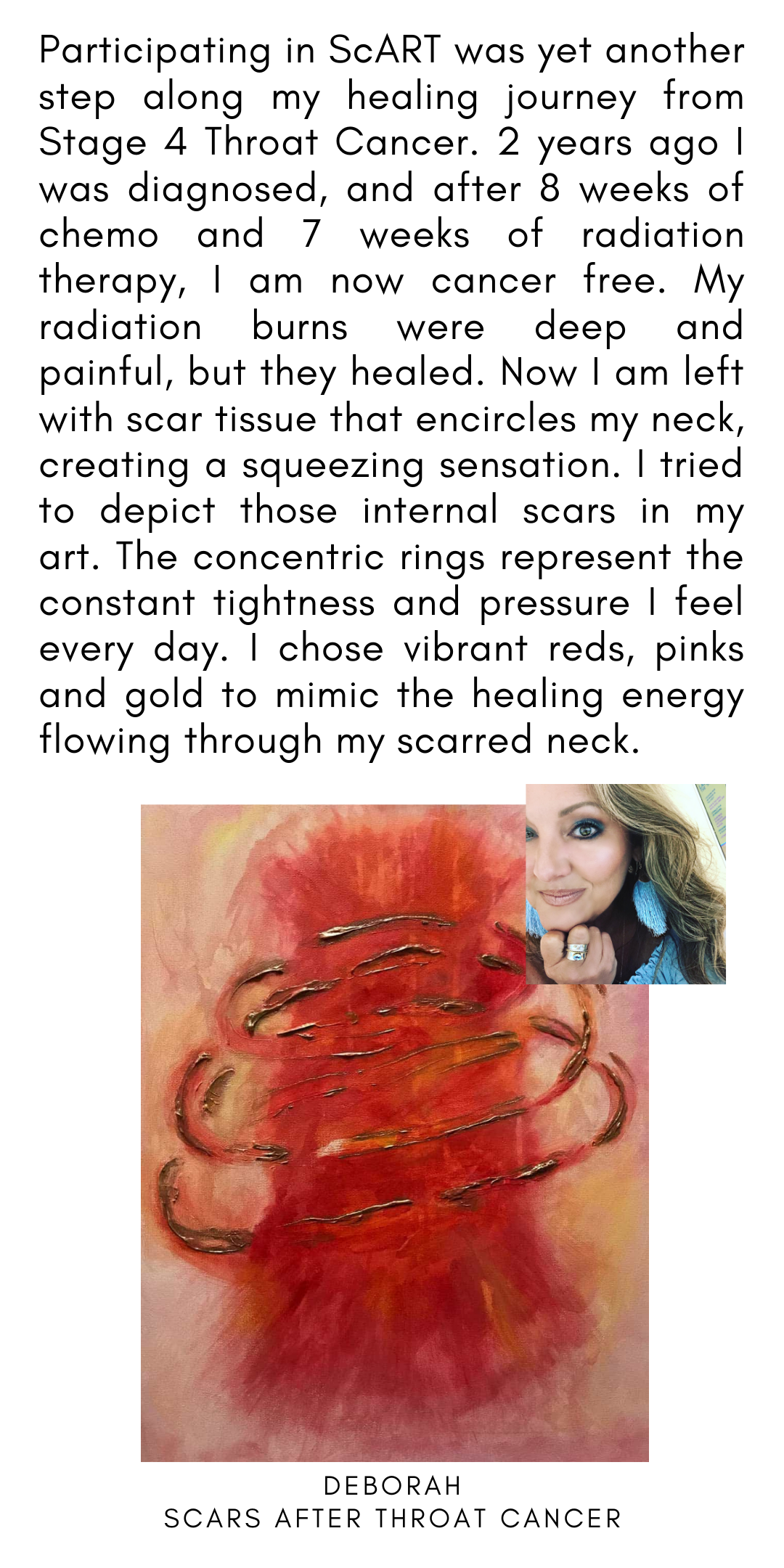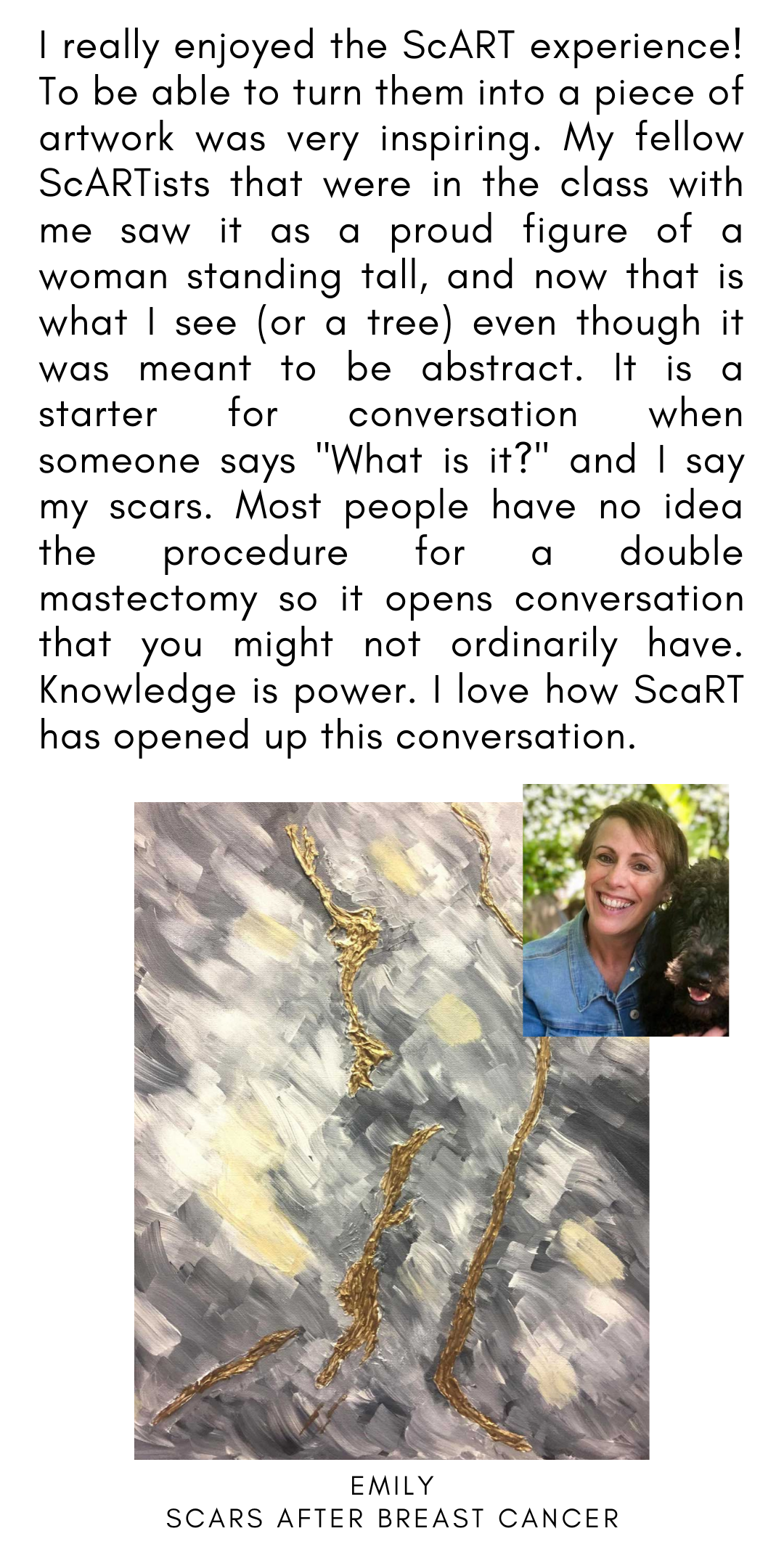 ScART (or “Scar Art”) is an abstract painting process where color theory and simple yet powerful painting techniques will be integrated to create a powerful, unique painting. Even if you’ve never painted before, class instructors will guide the class through the process of sketching the scar(s) on canvas, applying the modeling paste to represent scars unique markings, and to choosing just the right color palette to evoke the feelings you want to express. Simple brush strokes will be demonstrated for putting color on your painting. Remember – this is a unique and powerful experience where the PROCESS of seeing your scars turned into works of art is more significant than the PRODUCT, or actual artwork. Although the final product will be beautiful and meaningful, the shared experience and strong sensory memory you are creating with fellow scar bearers is even MORE important. Women, who can be hard on themselves, are given the freedom to transform their scars into something beautiful. The process allows for an open mind and the support of a community of other people who have experienced something similar.