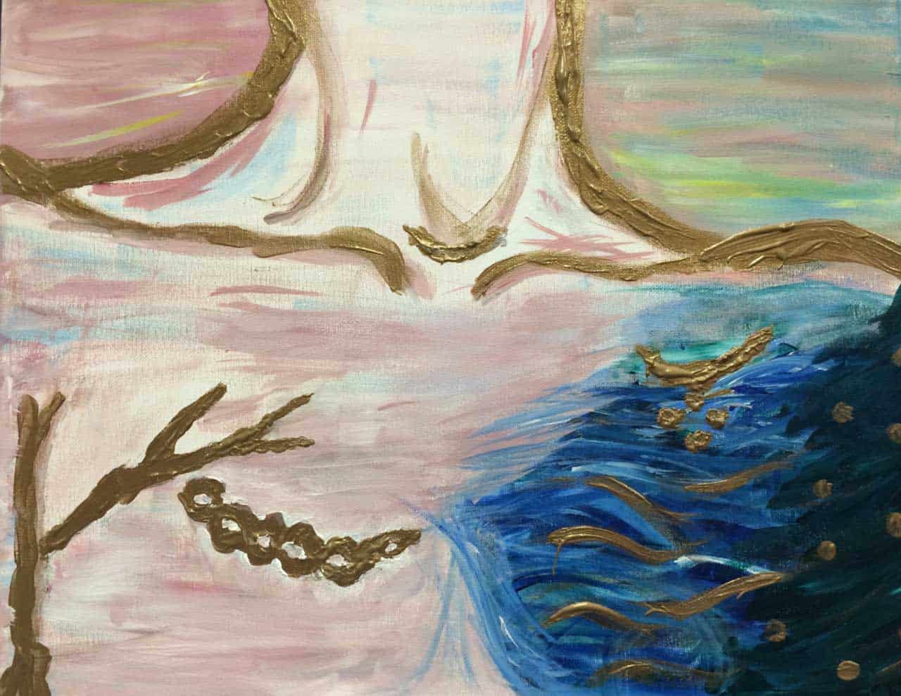 What did you learn from your ScART program? I was excited to hear about the ScART Project. I felt the free writing exercises and painting experience would be extremely cathartic, and they were. Writing to my scars and writing responses from them allowed me to address my sense of loss and anger and to address what I had gained and how I have grown since diagnosis and treatment. I did not want to magnify the scars and have them dominate the canvas, so I included a neck, chest, upper torso landscape with predominantly pink tones behind one shoulder and more blues on the other shoulder. I used gold to for the lines delineating my body because there have been many silver linings and golden opportunities since my diagnosis and as a result of the scars I have accumulated throughout diagnosis and treatment. My son’s favorite color is blue. I wanted blue and gold to dominate the canvas with warmth and comfort and hope and a sense of natural life processes. I was a bit frustrated with my lack of brushstroke techniques to execute the textures I had hoped but I was happy to see the colors play out in the cathartic manner I had hoped for.