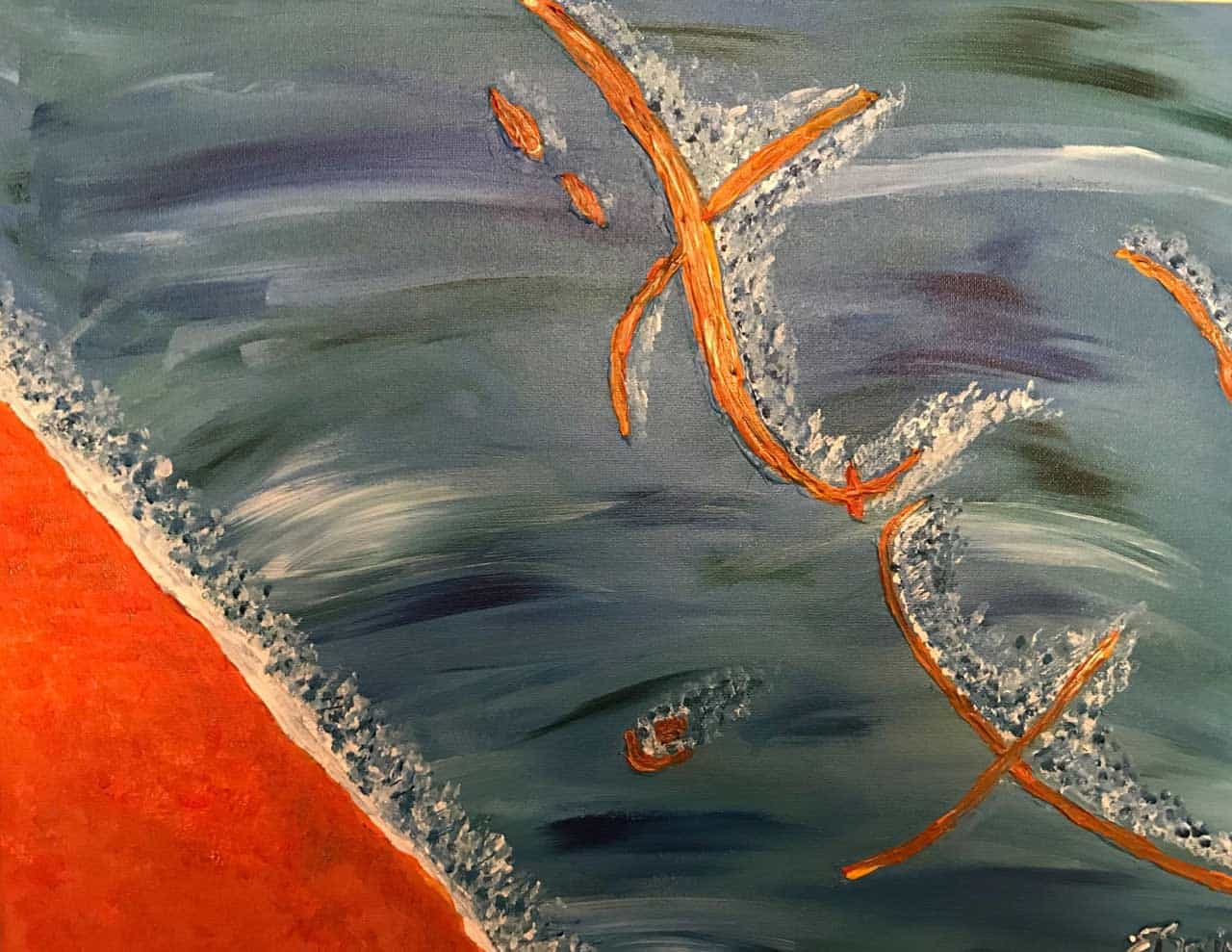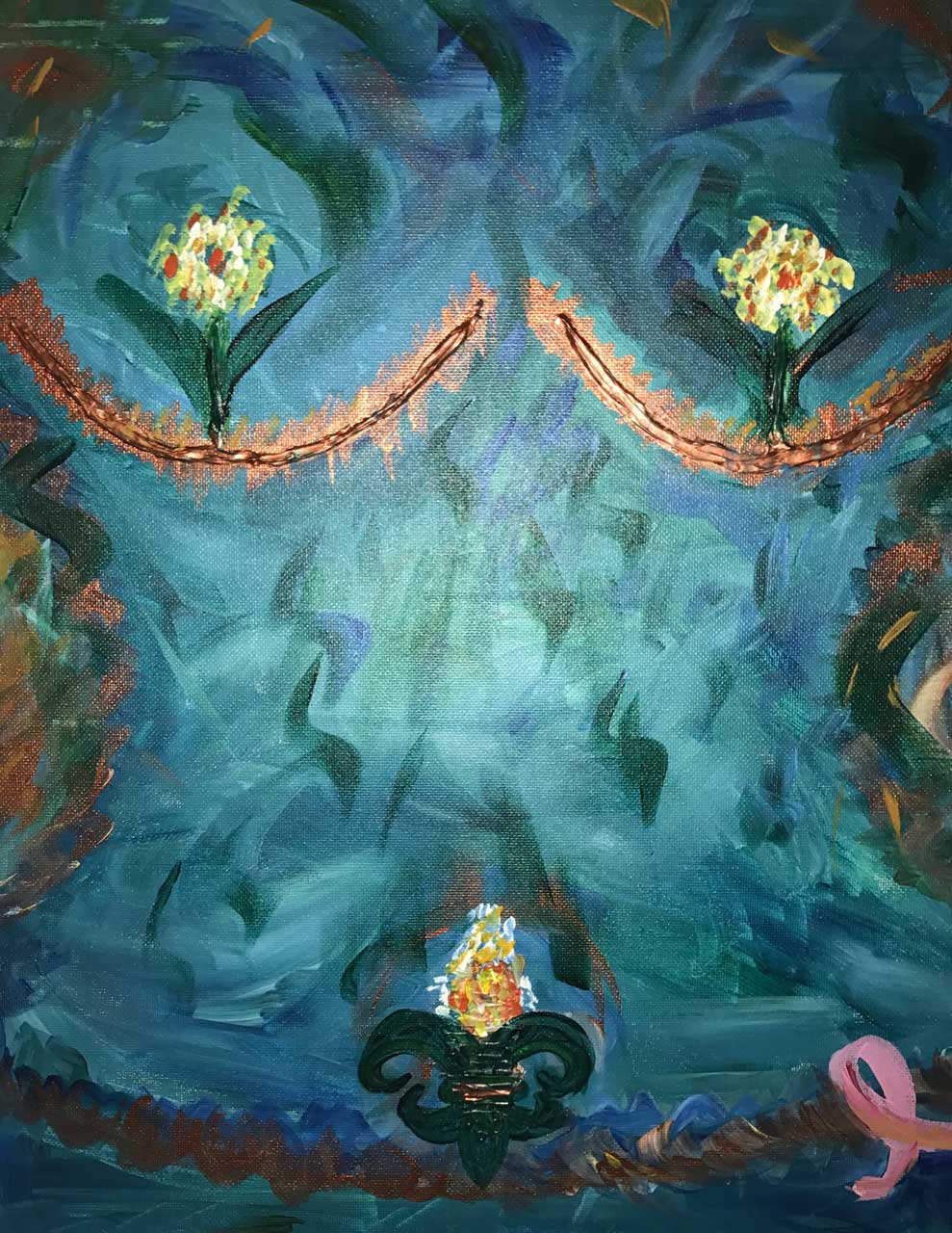 What did you learn from your ScART program? I really intended to be more abstract than I was. Since Grand Isle is my favorite place in the world, I have gone there since I was a little girl with my family. Grand Isle is what appeared in my picture. My scars became the edge of the water and the breakers or rock jetties you can find along the beach in places. Instead of a weakness, they represent a strength or protection. When I shared the painting with my family, my dad’s immediate response was, “You have the rock jetties, those are important and necessary to protect the island.” Since I chose to have a double mastectomy to protect against ever having to do this again, it is fitting these scars now represent a protection of someplace so loved and treasured by me. What many of you may not know is my husband also has scars. He had a birth defect in his heart and had to have aortic valve replacement at 41 years old. My kids have had to deal with the mortality of both of their parents in a short amount of time. I cannot wait for us to paint his scars to hang next to mine in our bedroom.